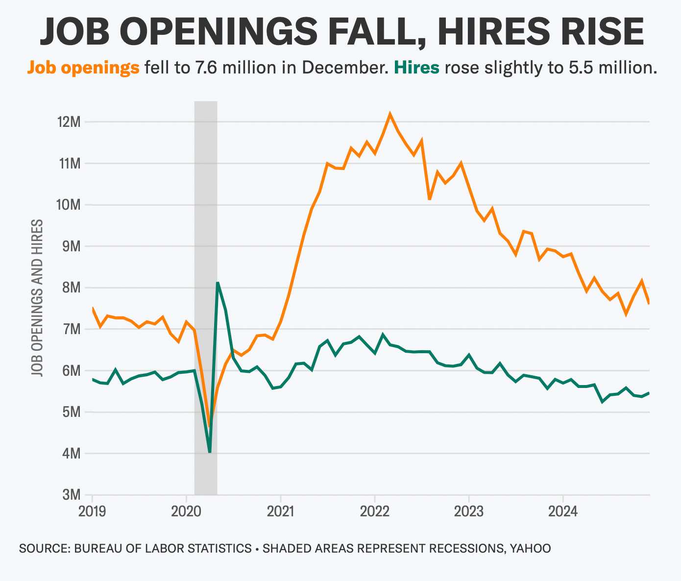 Hires: Up slightly to 5.46 million from 5.37 million in November, though the hiring rate held steady at 3.4% for the third month straight.